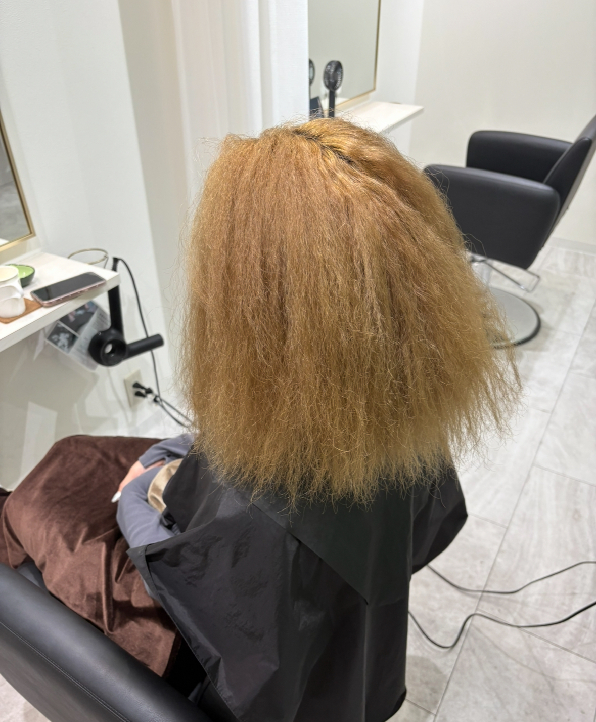 ブリーチ毛でかなりうねりのクセが細かい方の施術です。