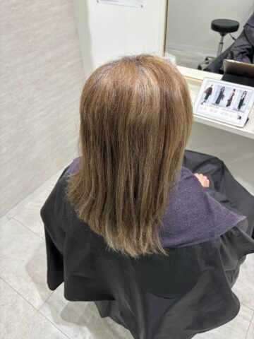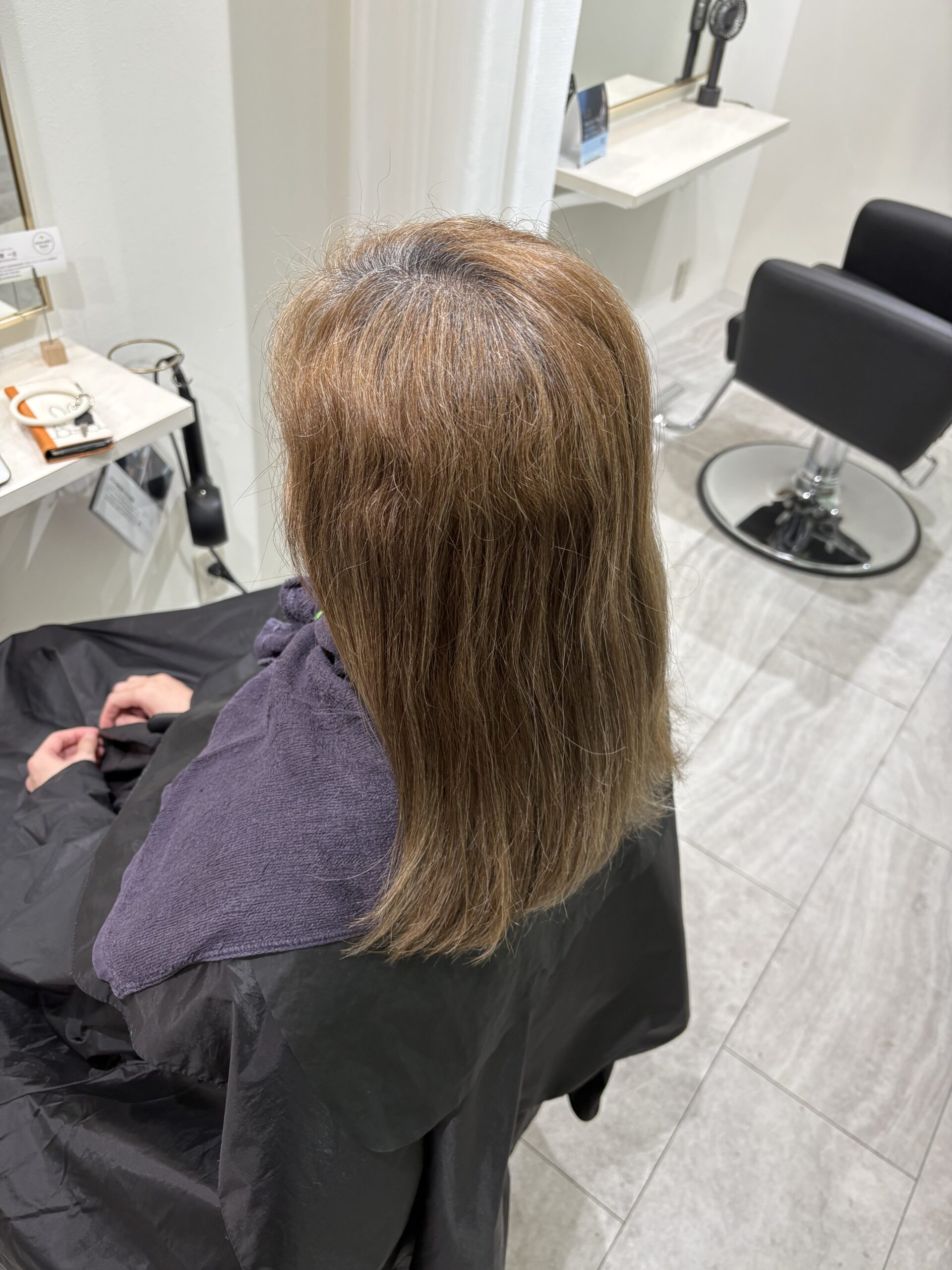 お客様は、他店で継続的に暗め白髪染めと縮毛矯正でダメージ毛の状態でした。これまで、何度か白髪が目立ちにくい