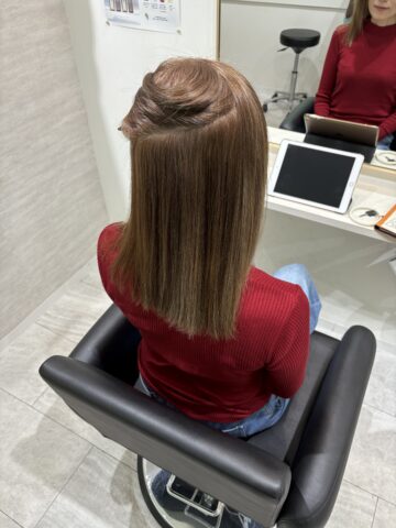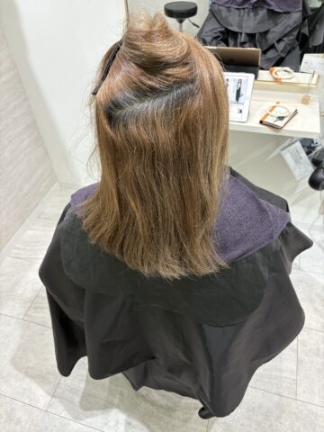 これまで他店で縮毛矯正をされていた部分にはややダメージが見受けられましたので、その部分は特に丁寧に毛髪強度を高めるケアを施しました。