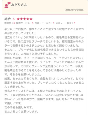そんな中、今回は、ずっと白髪染めで黒髪にし、うねりの強いクセ毛の方が、髪色を明るくしたいけど、ブリーチカラーすると縮毛矯正ができなくなる、というお悩みのお客様から、ホットペッパーに嬉しい口コミも頂きましたのでご紹介いたします。
