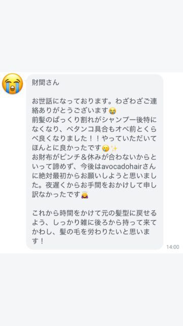 そんな中、他店縮毛矯正でアボカドヘアーをご利用になったお客様から嬉しいメッセージ頂きましたのでご紹介いたします。